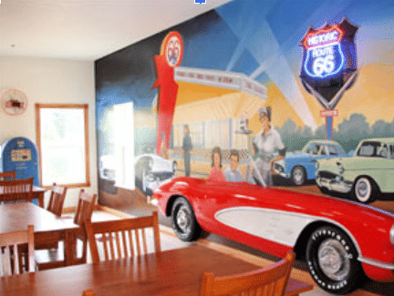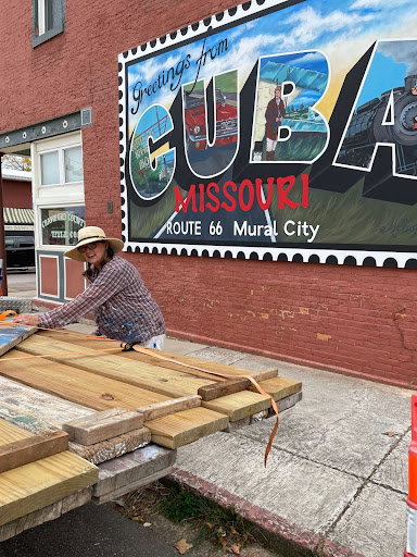 The first mural was done by a local artist Shelly Smith, the local high school art teacher. She found a mural artist in Canada who agreed to come down and help her paint her very first mural Michelle Loughery. Michelle came back to do a second mural. The first one got folks excited and Cuba continues to make murals. Now they have 16 outdoor murals, and many indoor murals. The grocery store truck stop has a 66 theme and local churches too all have different murals.