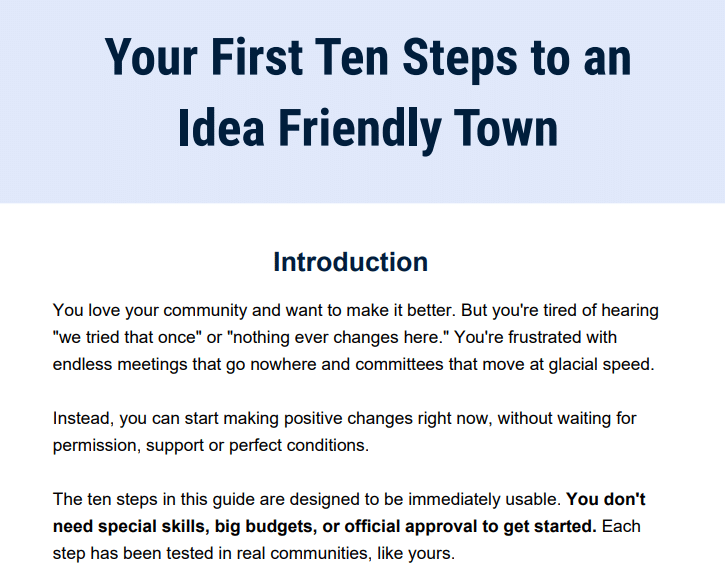 Get the First 10 Steps to Making Your Town Idea Friendly. No signup required, just practical steps you can start using right away. Download it at First 10 Steps.